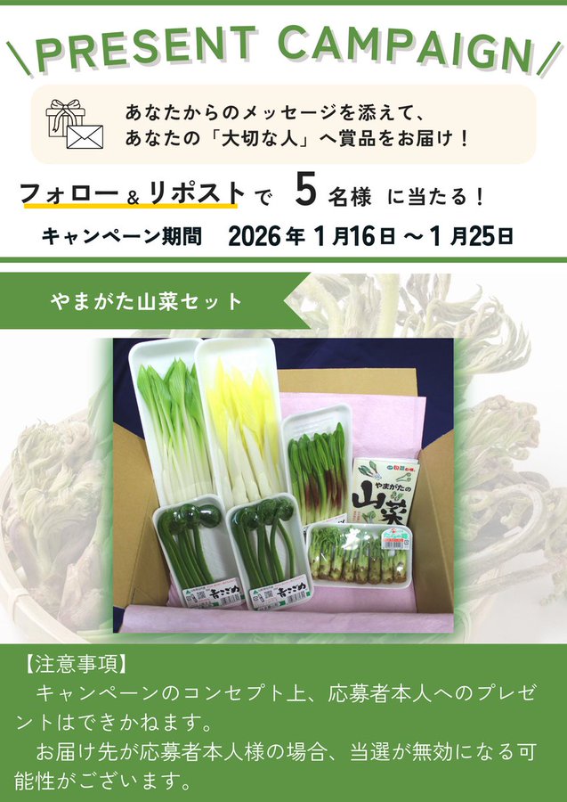 賞品:あなたの「大切な人」へ”やまがた山菜セット”(5名様)