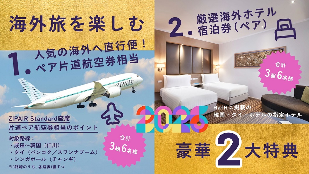 【X・Instagram懸賞】ZIPAIR Standard座席片道ペア航空券相当のポイント、指定海外ホテル ペア宿泊券を6組様にプレゼント