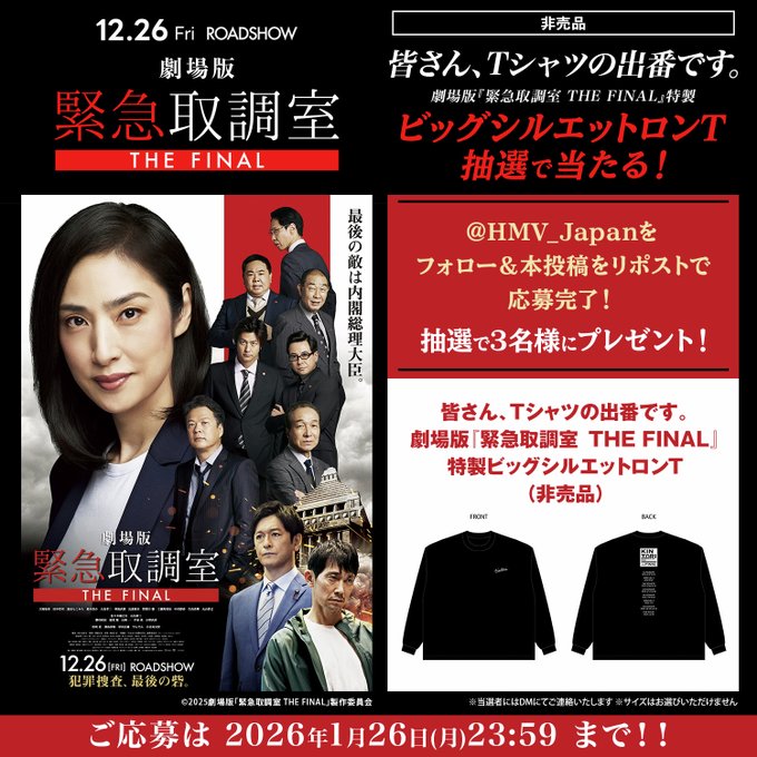 賞品:劇場版『緊急取調室 THE FINAL』特製ビッグシルエットロンT(3名様)