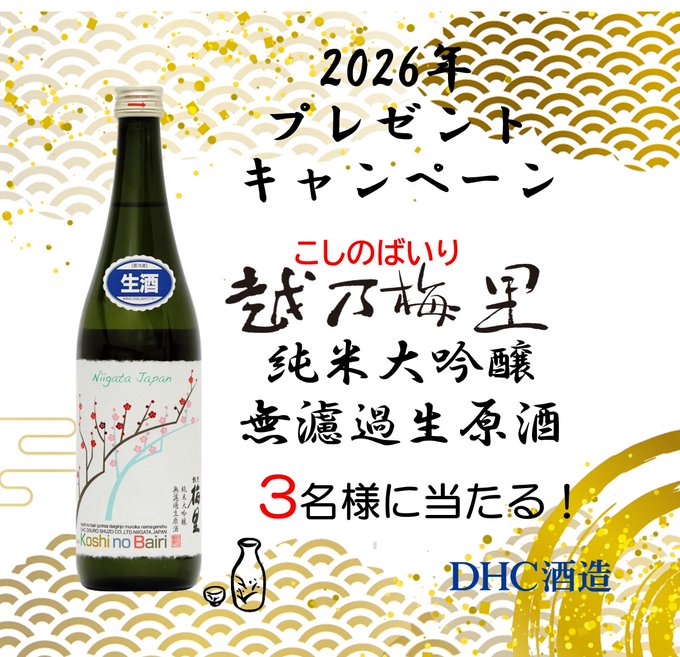 賞品:越乃梅里 純米大吟醸 無濾過生原酒(3名様)