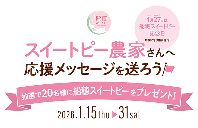 船穂スイートピーを20名様にプレゼント 2026.01.24JA晴れの国岡山‐スイートピー農家さんへ応援メッセージを送ろう!キャンペーン 賞品:船穂スイートピー(20名様) 締切:2026年1月31日(土)アンケートに答えてご応募ください。※詳細はキャンペーンページにてご確認ください。応募はこちらから