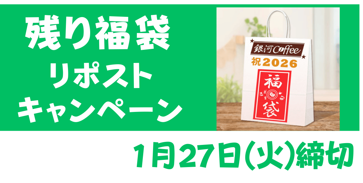 【X懸賞】銀河コーヒー 残り福袋を4名様にプレゼント 2026.01.25銀河コーヒー‐フォロー&リポストキャンペーン 賞品:残り福袋(4名様) 締切:2026年1月27日(火)公式X(Twitter)アカウントをフォロー&キャンペーン対象ポストをリポストしてご応募ください。※詳細はキャンペーンページにてご確認ください。応募はこちらから