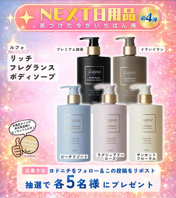 【X懸賞】Lujoso リッチフレグランスボディソープを25名様にプレゼント 2026.01.25ヨドバシ@日用品専門‐プレゼントキャンペーン 賞品:Lujoso(ルフォ)リッチフレグランスボディソープ(25名様) 締切:2026年1月27日(火)👉フォロー&リポスト👉どの香りを使ってみたい?✍️※詳細はキャンペーンページにてご確認ください。応募はこちらから