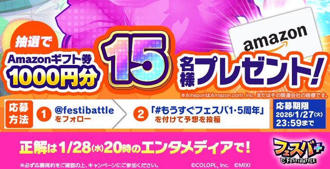 「Amazonギフト券1000円」が抽選で15名に当たりますよ!