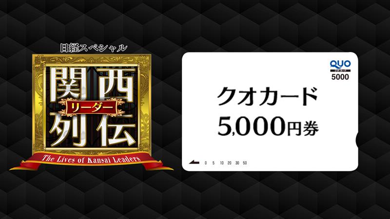 QUOカード5,000円分を3名様にプレゼント 2026.01.25日経スペシャル 関西リーダー列伝‐プレゼントキャンペーン 賞品:QUOカード5,000円分(3名様) 締切:2026年2月8日(日)13:59ご応募には会員登録/ログインが必要です。※詳細はキャンペーンページにてご確認ください。応募はこちらから