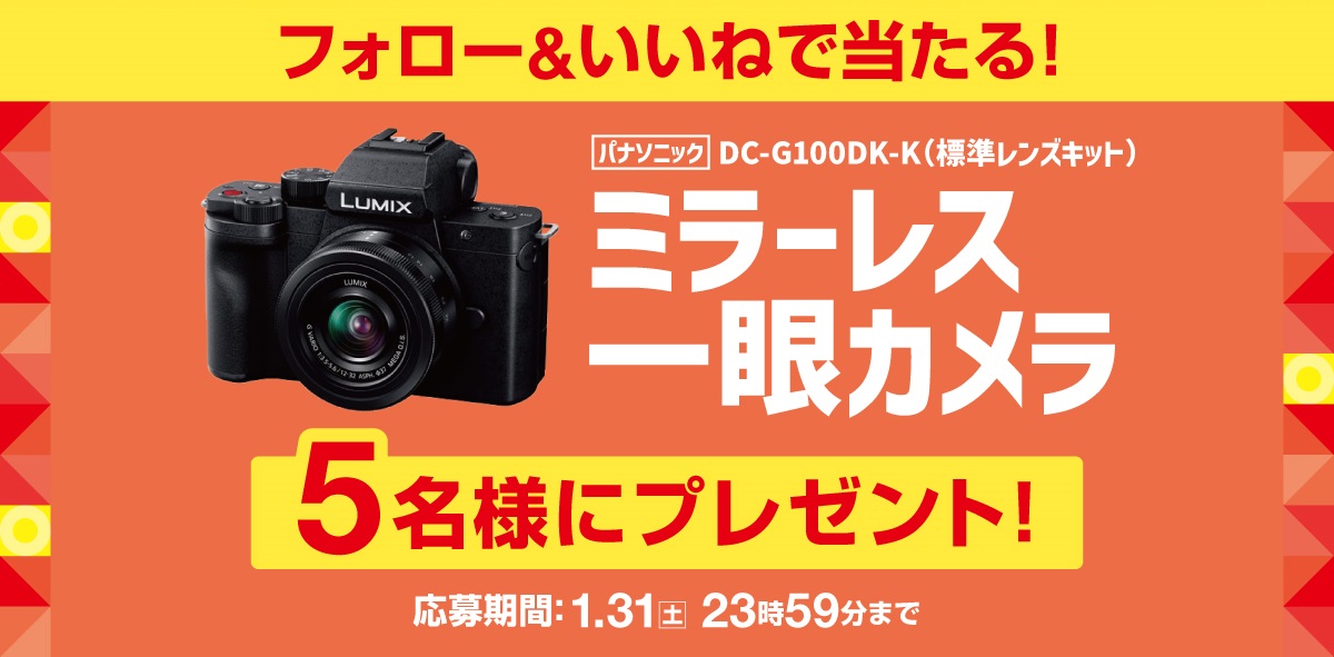 賞品:パナソニック ミラーレス一眼カメラ​ DC-G100DK-K(標準レンズキット)​(5名様)