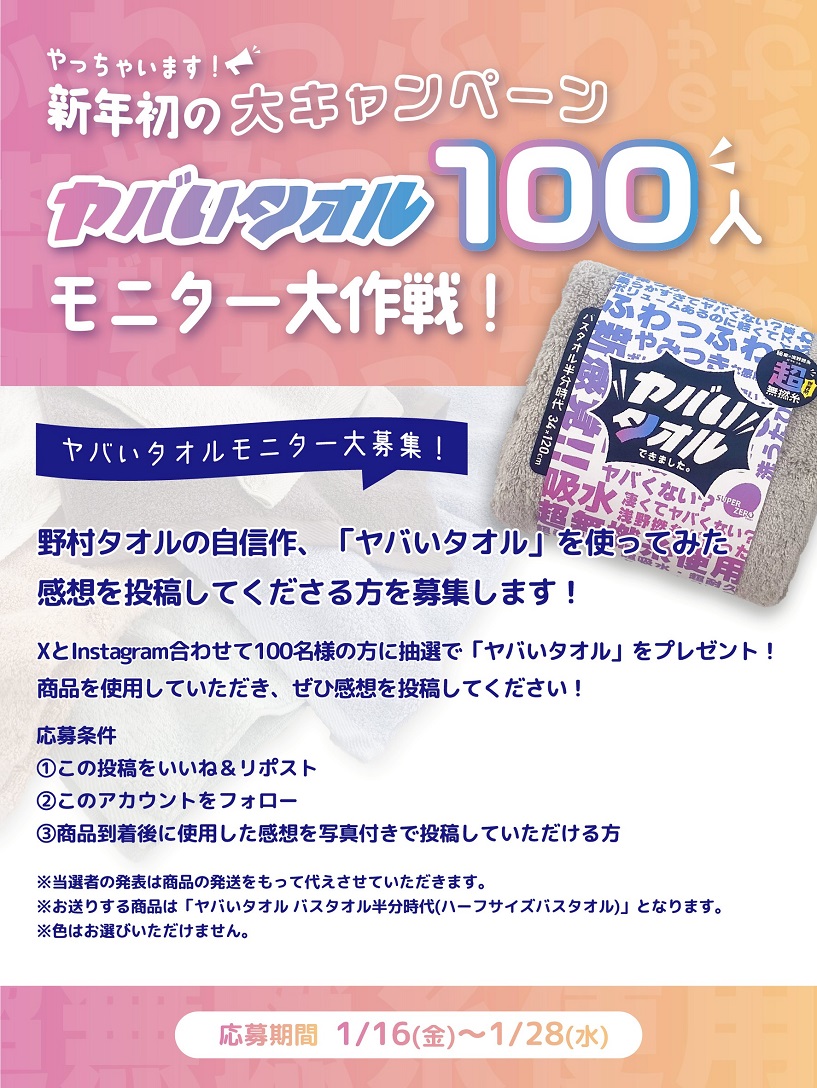 XとInstagram合わせて100名様の方に抽選でヤバいタオルをプレゼント!