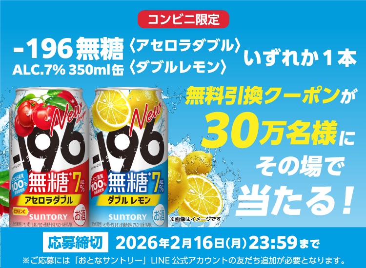 賞品:「-196無糖〈アセロラダブル〉ALC.7% 350ml缶」「-196無糖〈ダブルレモン〉ALC.7% 350ml缶」いずれか1本の無料引換券(30万名様)
