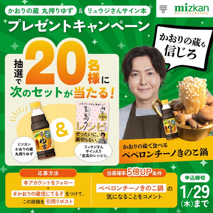 賞品:かおりの蔵丸搾りゆず&サイン入り至高のレシピ3(20名様)