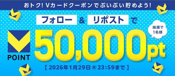 【X懸賞】Vポイント5万ポイントを1名様にプレゼント 2026.01.27Vポイント‐フォロー&リポストキャンペーン 賞品:Vポイント5万ポイント(1名様) 締切:2026年1月29日(木)公式X(Twitter)アカウントをフォロー&キャンペーン対象ポストをリポストしてご応募ください。※詳細はキャンペーンページにてご確認ください。応募はこちらから