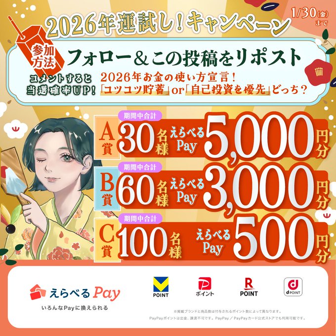 【X懸賞】えらべるPay最大5,000円分を合計190名様にプレゼント