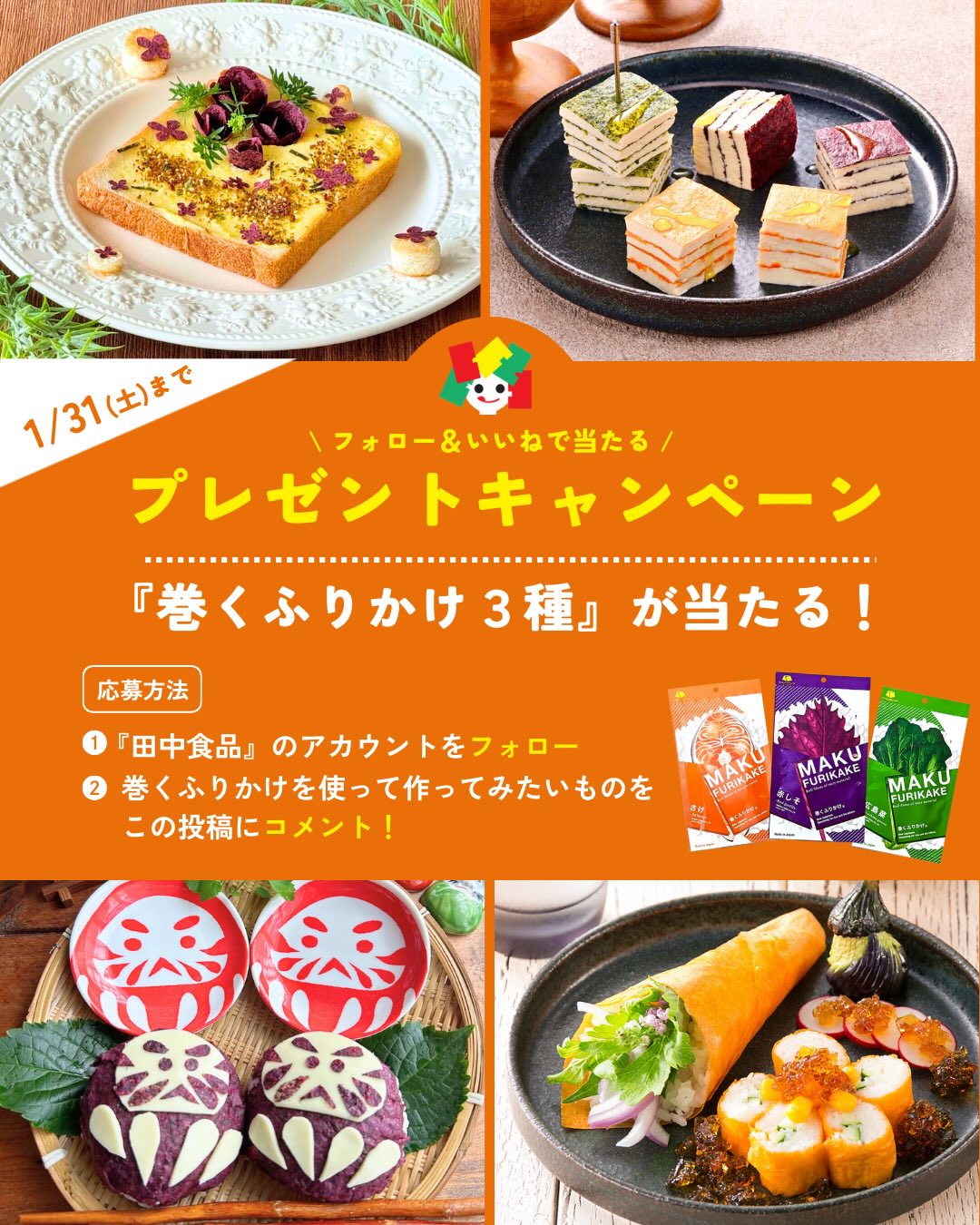 【Instagram懸賞】巻くふりかけ3種セットを10名様にプレゼント 2026.01.28田中食品株式会社‐プレゼントキャンペーン 賞品:巻くふりかけ3種セット(10名様) 締切:2026年1月31日(土)応募方法: アカウントをフォロー 投稿に「巻きふりかけを使ったアレンジアイデア」をコメント※詳細はキャンペーンページにてご確認ください。応募はこちらから