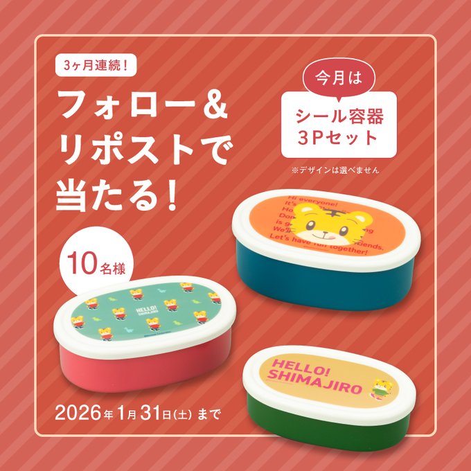 【X懸賞】シール容器3Pセットを10名様にプレゼント 2026.01.28しまじろう‐フォロー&リポストキャンペーン 賞品:シール容器3Pセット(10名様) 締切:2026年1月31日(土)公式X(Twitter)アカウントをフォロー&キャンペーン対象ポストをリポストしてご応募ください。※詳細はキャンペーンページにてご確認ください。応募はこちらから