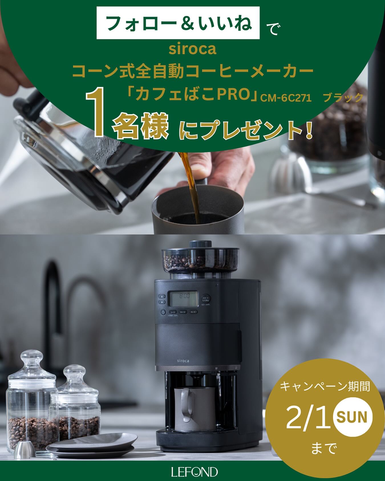 賞品:siroca「コーン式全自動コーヒーメーカー カフェばこPRO」CM-6C271(1名様)