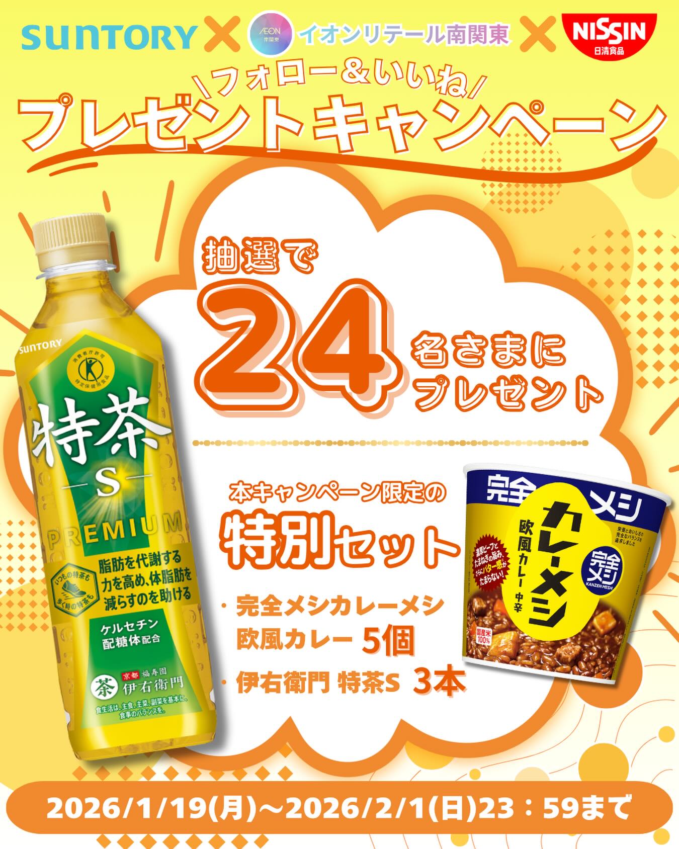 賞品:完全メシカレーメシ5個+特茶3本セット(24名様)
