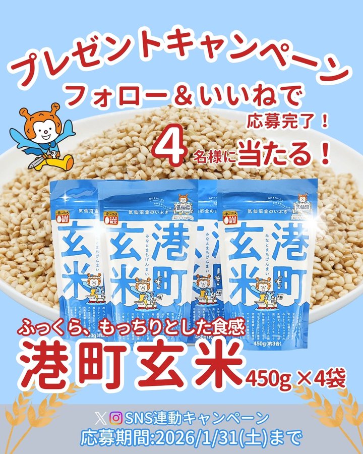 【X・Instagram懸賞】港町玄米 450g×4袋を4名様にプレゼント 2026.01.29気仙沼市ふるさと納税‐プレゼントキャンペーン 賞品:港町玄米 450g ×4袋(4名様) 締切:2026年1月31日(土)フォロー&いいねでプレゼントをGET!Instagramからも応募できます。※詳細はキャンペーンページにてご確認ください。応募はこちらから
