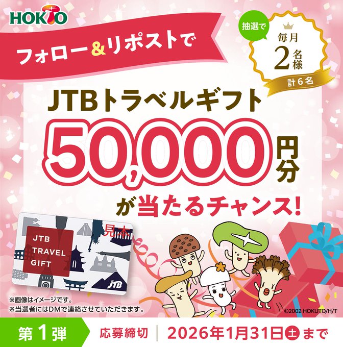 賞品:JTBトラベルギフト50,000円分(2名様)