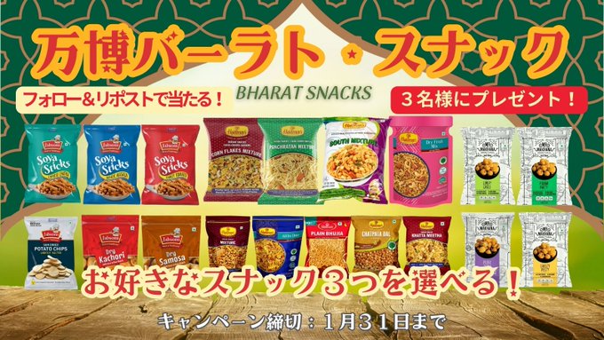 賞品:万博バーラト・スナック選べる3袋(3名様)