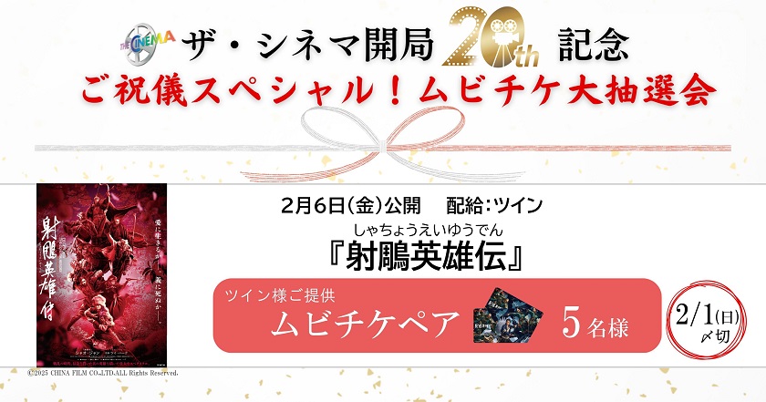 映画『射鵰英雄伝』ムビチケペアを5名様にプレゼント 2026.01.29ザ・シネマ開局20周年記念 ムビチケ大抽選会 賞品:映画『射鵰英雄伝』ムビチケペア(5名様) 締切:2026年2月1日(日)アンケートに答えてご応募ください。※詳細はキャンペーンページにてご確認ください。応募はこちらから