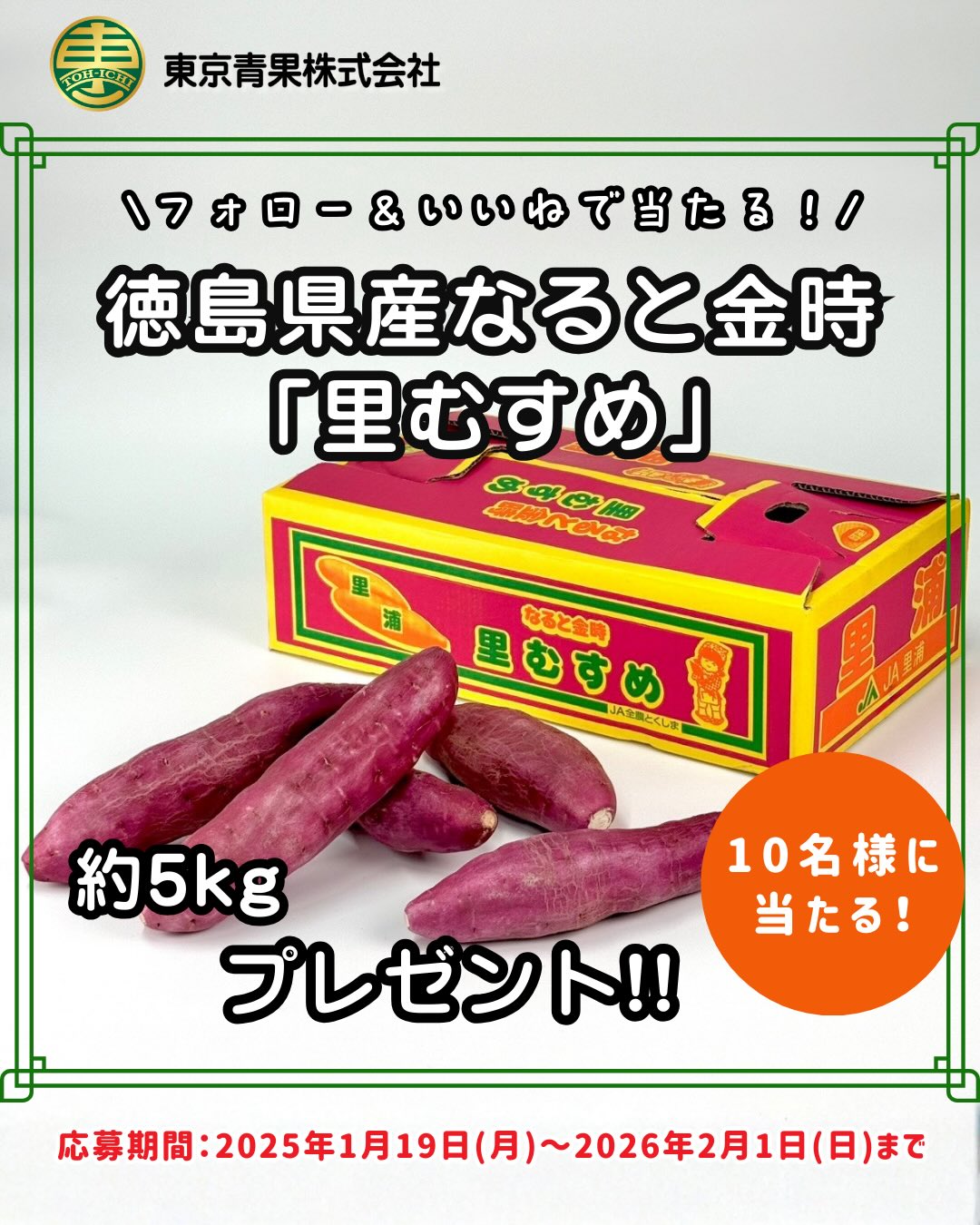【Instagram懸賞】徳島県産 里むすめを10名様にプレゼント 2026.01.30東京青果‐フォロー&いいねキャンペーン 賞品:徳島県産 里むすめ(10名様) 締切:2026年2月1日(日)応募方法: 1. 公式Instagramアカウントをフォロー 2. 対象の投稿に「いいね!」※詳細はキャンペーンページにてご確認ください。応募はこちらから