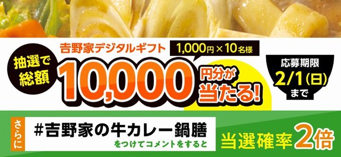 賞品:吉野家デジタルギフト1,000円分(10名様)
