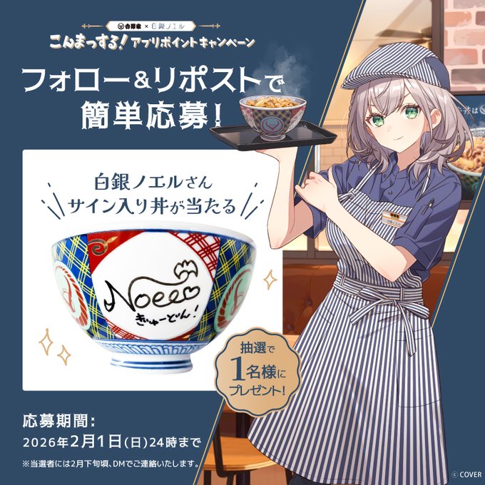 【X懸賞】白銀ノエルさん直筆サイン入り丼ぶりを1名様にプレゼント 2026.01.30吉野家×白銀ノエル コラボ記念 賞品:直筆サイン入り丼ぶり(1名様) 締切:2026年2月1日(日)公式X(Twitter)アカウントをフォロー&キャンペーン対象ポストをリポストしてご応募ください。※詳細はキャンペーンページにてご確認ください。応募はこちらから