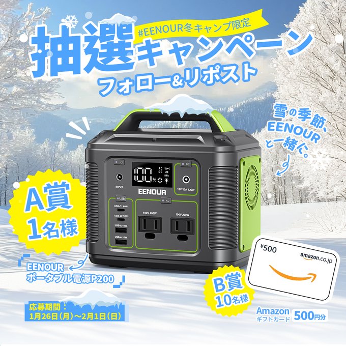 賞品:ポータブル電源P200、Amazonギフト券500円分(11名様)