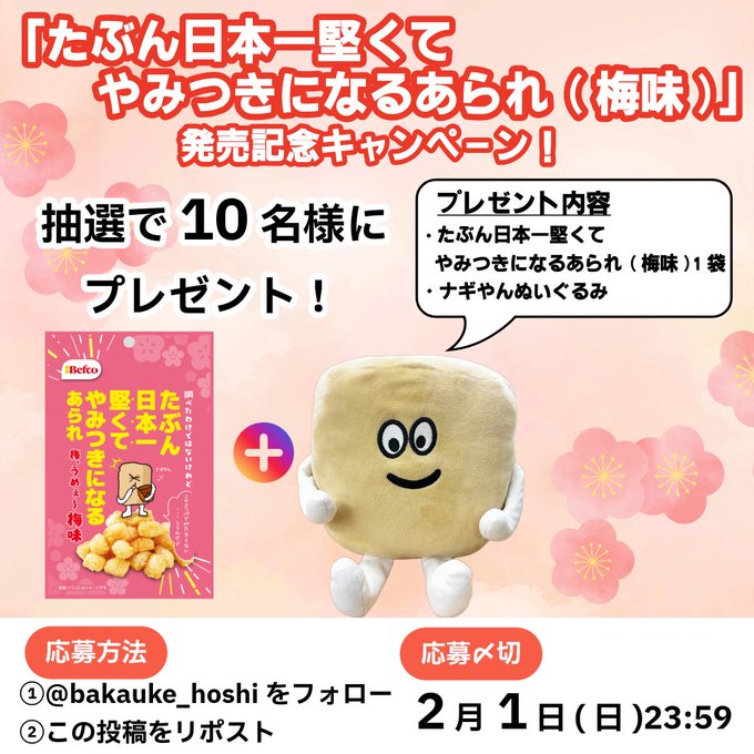 【X懸賞】新商品とナギやんのぬいぐるみを10名様にプレゼント 2026.01.30Befco/ばかうけ&星たべよ‐プレゼントキャンペーン 賞品:新商品とナギやんのぬいぐるみ(10名様) 締切:2026年2月1日(日)【応募方法】 ①Befco公式Xのフォロー ②投稿をリポストまたは引用リポスト※詳細はキャンペーンページにてご確認ください。応募はこちらから