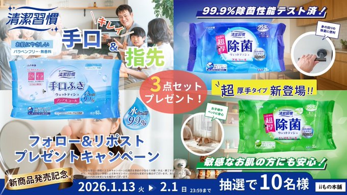 賞品:清潔習慣 ウェットティシュ 3点セット(10名様)