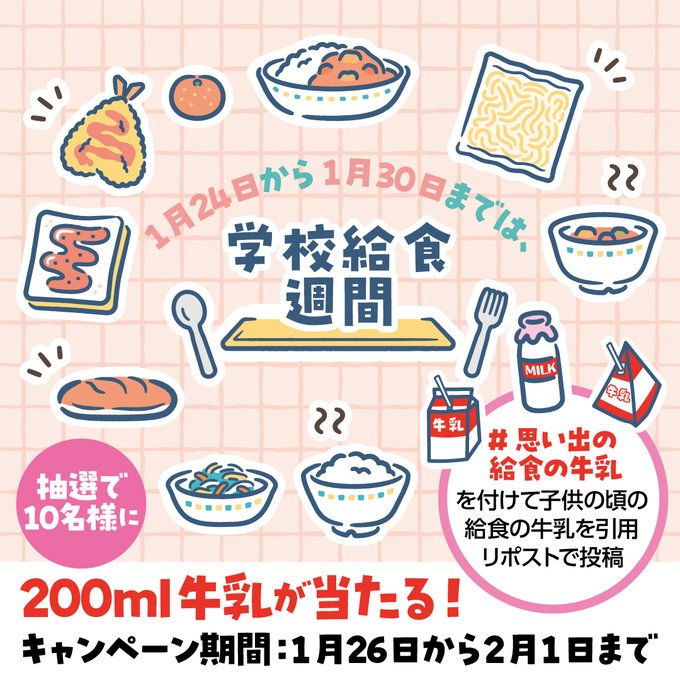 【X懸賞】200mlサイズの給食用 農協牛乳を10名様にプレゼント 2026.01.30メイトー/協同乳業‐給食の牛乳エピソード 投稿キャンペーン 賞品:200mlサイズの給食用 #農協牛乳(10名様) 締切:2026年2月1日(日)#思い出の給食の牛乳🥛を付けて皆さんの給食の牛乳エピソードを教えてください※詳細はキャンペーンページにてご確認ください。応募はこちらから