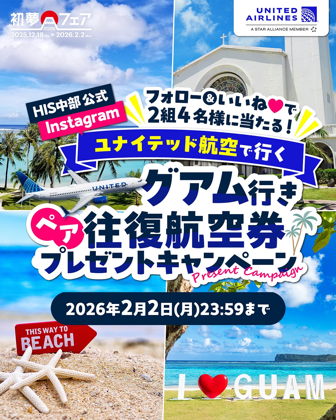 賞品:ユナイテッド航空利用 グアム行きペア往復航空券(2組4名様)