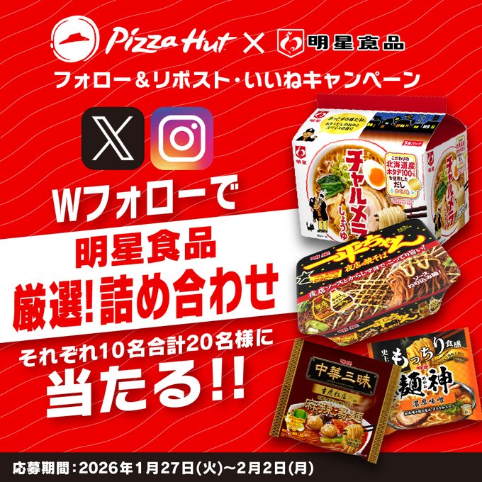 【X・Instagram懸賞】明星食品 厳選!詰め合わせを合計20名様にプレゼント 2026.01.31ピザハット×明星食品コラボキャンペーン 賞品:明星食品 厳選!詰め合わせ(合計20名様) 締切:2026年2月2日(月)@myojofoods_jpと@Pizza_Hut_Japanをフォロー&キャンペーン対象ポストをリポストしてご応募ください。Instagramからも応募できます。※詳細はキャンペーンページにてご確認ください。応募はこちらから