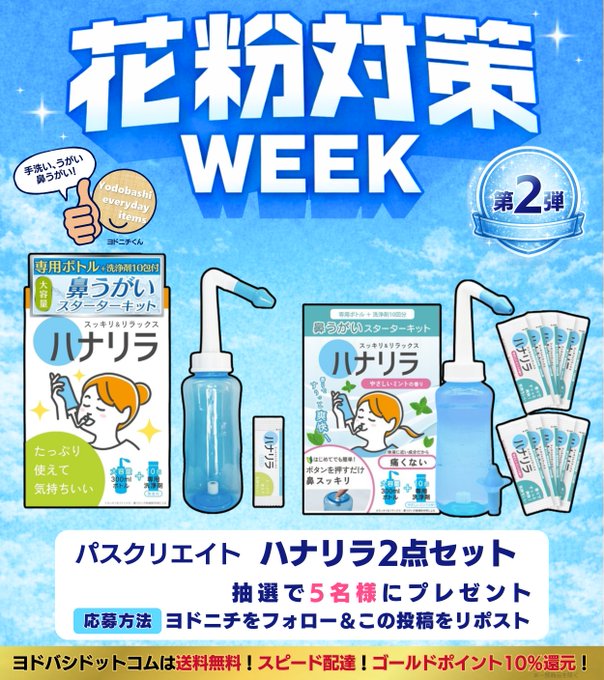 【X懸賞】パスクリエイト「ハナリラ」2種セットを5名様にプレゼント 2026.01.31ヨドバシ@日用品専門‐プレゼントキャンペーン 賞品:パスクリエイト「ハナリラ」2種セット(5名様) 締切:2026年2月2日(月)👉フォロー&リポスト👉花粉、どのくらい辛いですか?✍️※詳細はキャンペーンページにてご確認ください。応募はこちらから