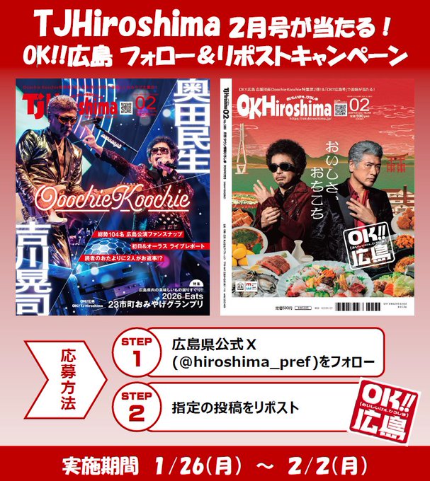 賞品:TJ Hiroshima 2月号&OK!!広島オリジナルノベルティ(5名様)