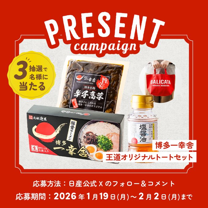 【X懸賞】博多一幸舎の王道オリジナルトートセットを3名様にプレゼント 2026.01.31日産福岡販売株式会社‐プレゼントキャンペーン 賞品:博多一幸舎の王道オリジナルトートセット(3名様) 締切:2026年2月2日(月)応募方法: アカウントをフォロー 投稿にコメント※詳細はキャンペーンページにてご確認ください。応募はこちらから