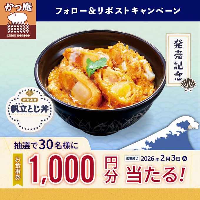 【X懸賞】お食事券1,000円分を30名様にプレゼント 2026.02.01かつ庵‐帆立フライ発売記念 賞品:お食事券1,000円分(30名様) 締切:2026年2月3日(火)公式X(Twitter)アカウントをフォロー&キャンペーン対象ポストをリポストしてご応募ください。※詳細はキャンペーンページにてご確認ください。応募はこちらから