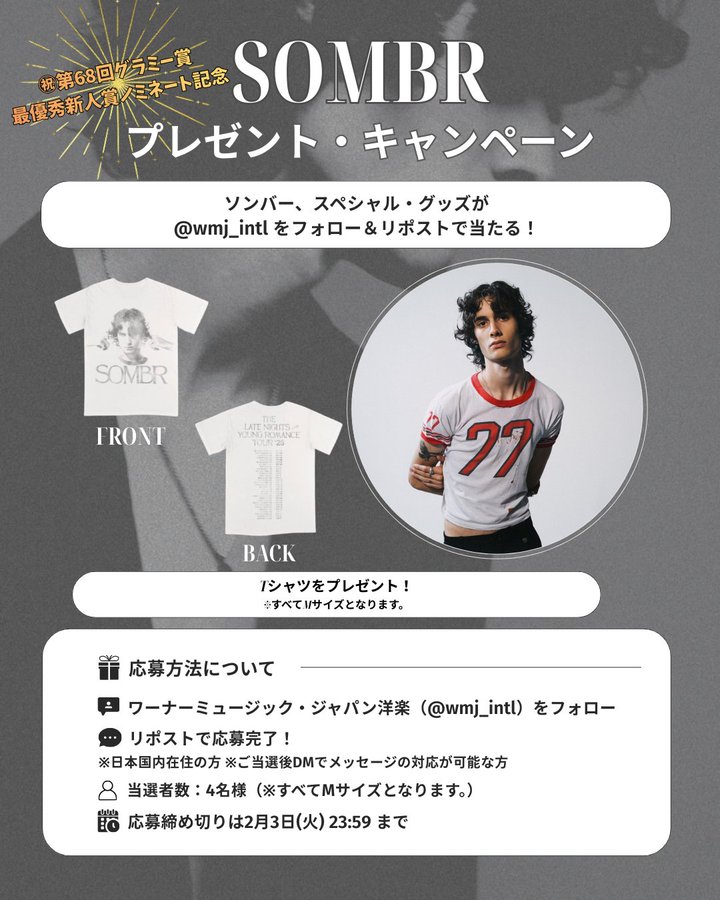 賞品:sombr Tシャツ(Mサイズ)(4名様)
