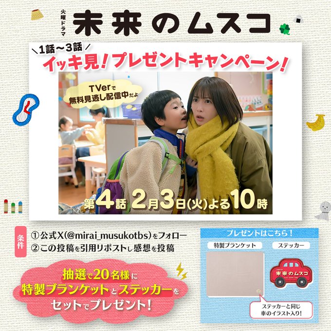 【X懸賞】特製ブランケット&ステッカーを20名様にプレゼント 2026.02.01TBS火曜ドラマ『未来のムスコ』‐視聴者プレゼントキャンペーン 賞品:特製ブランケット&ステッカー(20名様) 締切:2026年2月3日(火)応募方法: 公式Xをフォロー&投稿を引用リポストしてドラマの感想を投稿※詳細はキャンペーンページにてご確認ください。応募はこちらから