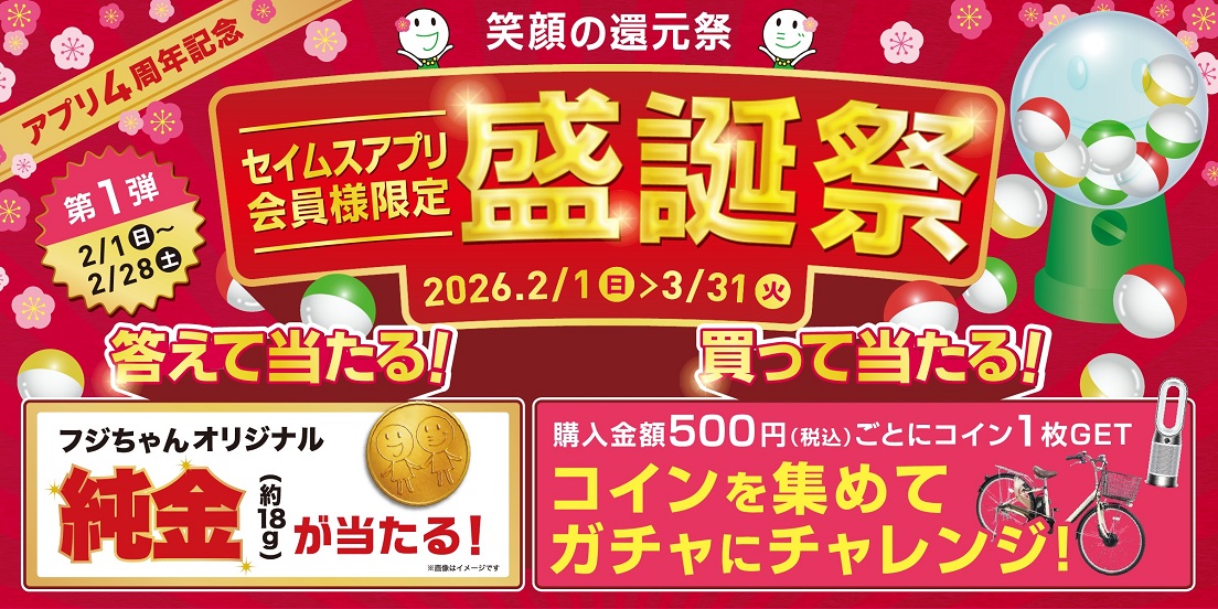 【アプリ】フジちゃんオリジナル純金(約18g)を5名様にプレゼント 2026.02.01富士薬品ドラッグストアグループ‐セイムス アプリ4周年記念 盛誕祭 賞品:フジちゃんオリジナル純金 約18g(5名様) 締切:2026年3月31日(火)クイズに答えてご応募ください。※詳細はキャンペーンページにてご確認ください。応募はこちらから