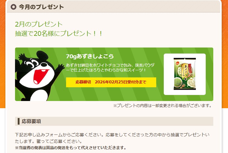 でん六「あずきしょこら」を20名様にプレゼント 2026.02.01でん六‐今月のプレゼント 賞品:70gあずきしょこら(20名様) 締切:2026年2月25日(水)応募フォームより必要事項を入力してご応募ください。※詳細はキャンペーンページにてご確認ください。応募はこちらから