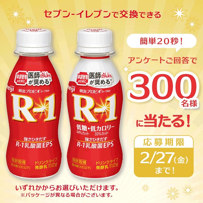 【LINE懸賞】明治プロビオヨーグルト R-1 ドリンクタイプ 無料引き換えクーポンが300名様にその場で当たる! 2026.02.02フコク生命‐プレゼントキャンペーン 賞品:明治プロビオヨーグルト R-1 ドリンクタイプ 無料引き換えクーポン(300名様) 締切:2026年2月27日(金)アンケートに答えてご応募ください。※詳細はキャンペーンページにてご確認ください。応募はこちらから