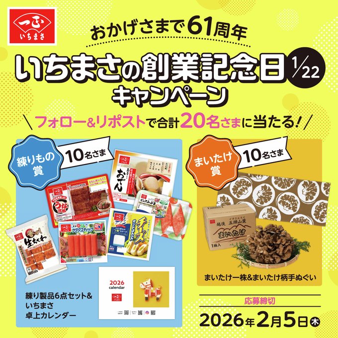 賞品:いちまさ 練りもの、まいたけ、グッズ(合計20名様)