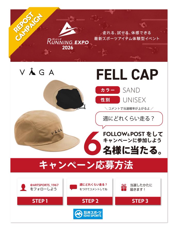 【X懸賞】FELL CAPを6名様にプレゼント 2026.02.03アートスポーツ‐プレゼントキャンペーン 賞品:FELL CAP(6名様) 締切:2026年2月5日(木)① @ARTSPORTS_1967をフォロー ② 週にどれくらい走るかを教えてね※詳細はキャンペーンページにてご確認ください。応募はこちらから