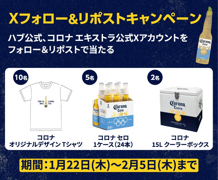 @HUB_82 @CoronaExtraJPN をフォロー&キャンペーン対象ポストをリポストしてご応募ください。