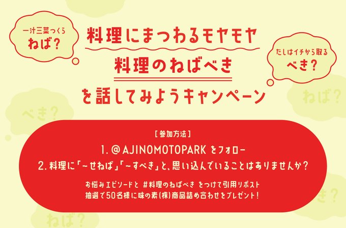 【X懸賞】味の素社商品詰め合わせを50名様にプレゼント 2026.02.03味の素パーク‐プレゼントキャンペーン 賞品:味の素社商品詰め合わせ(50名様) 締切:2026年2月5日(木)①@AJINOMOTOPARKをフォロー ②お悩みエピソードと #料理のねばべき で引用リポスト※詳細はキャンペーンページにてご確認ください。応募はこちらから