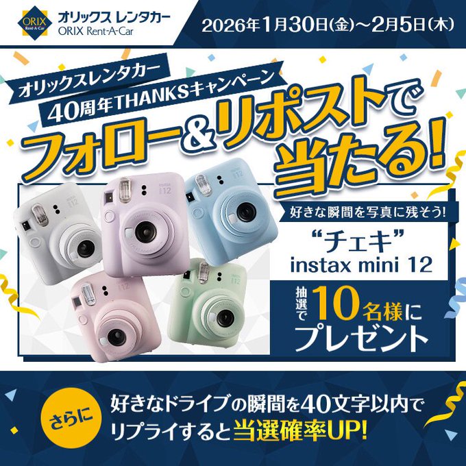 賞品:富士フイルム instax mini 12 チェキ(10名様)