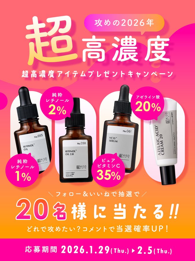 【X懸賞】超高濃度アイテムを20名様にプレゼント 2026.02.03KISO CARE‐フォロー&リポストキャンペーン 賞品:超高濃度アイテム(20名様) 締切:2026年2月5日(木)公式X(Twitter)アカウントをフォロー&キャンペーン対象ポストをリポストしてご応募ください。※詳細はキャンペーンページにてご確認ください。応募はこちらから