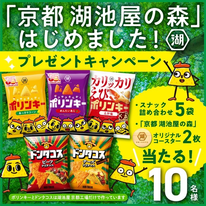 賞品:京都工場で作られた湖池屋スナック5袋&オリジナルコースター2枚(10名様)