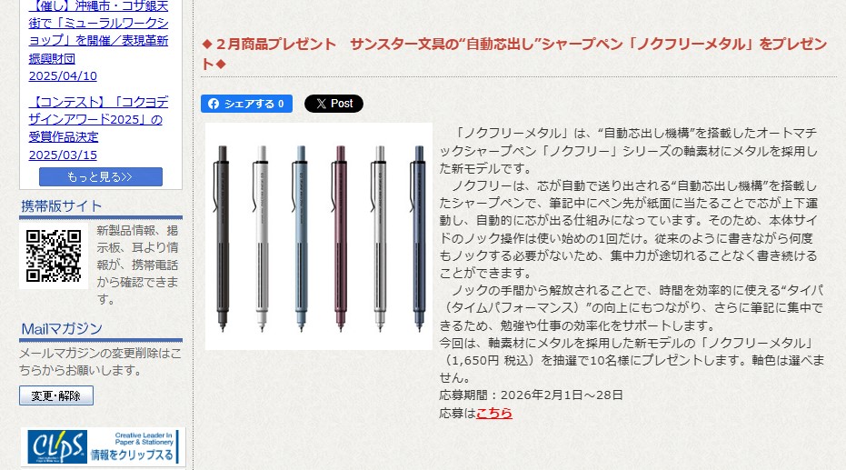 サンスター文具の“自動芯出し”シャープペン「ノクフリーメタル」を10名様にプレゼント 2026.02.03文房具屋さんドットコム‐プレゼントキャンペーン 賞品:サンスター文具の“自動芯出し”シャープペン「ノクフリーメタル」(10名様) 締切:2026年2月28日(土)アンケートに答えてご応募ください。※詳細はキャンペーンページにてご確認ください。応募はこちらから