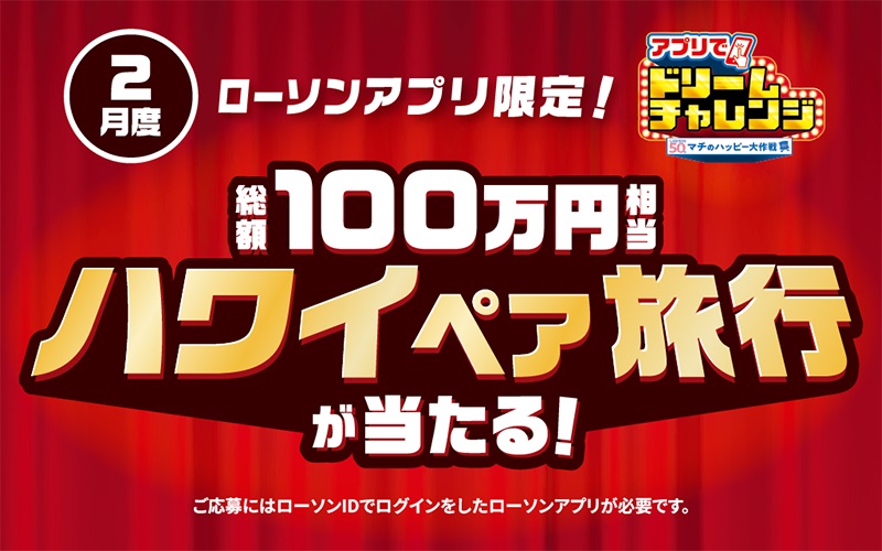 【アプリ】100万円相当のハワイペア5日間旅行を1組2名様にプレゼント 2026.02.03ローソン‐アプリでドリームチャレンジ 賞品:100万円相当のハワイペア5日間旅行(1組2名様) 締切:2026年2月28日(土)アプリ内からご応募ください。※詳細はキャンペーンページにてご確認ください。応募はこちらから